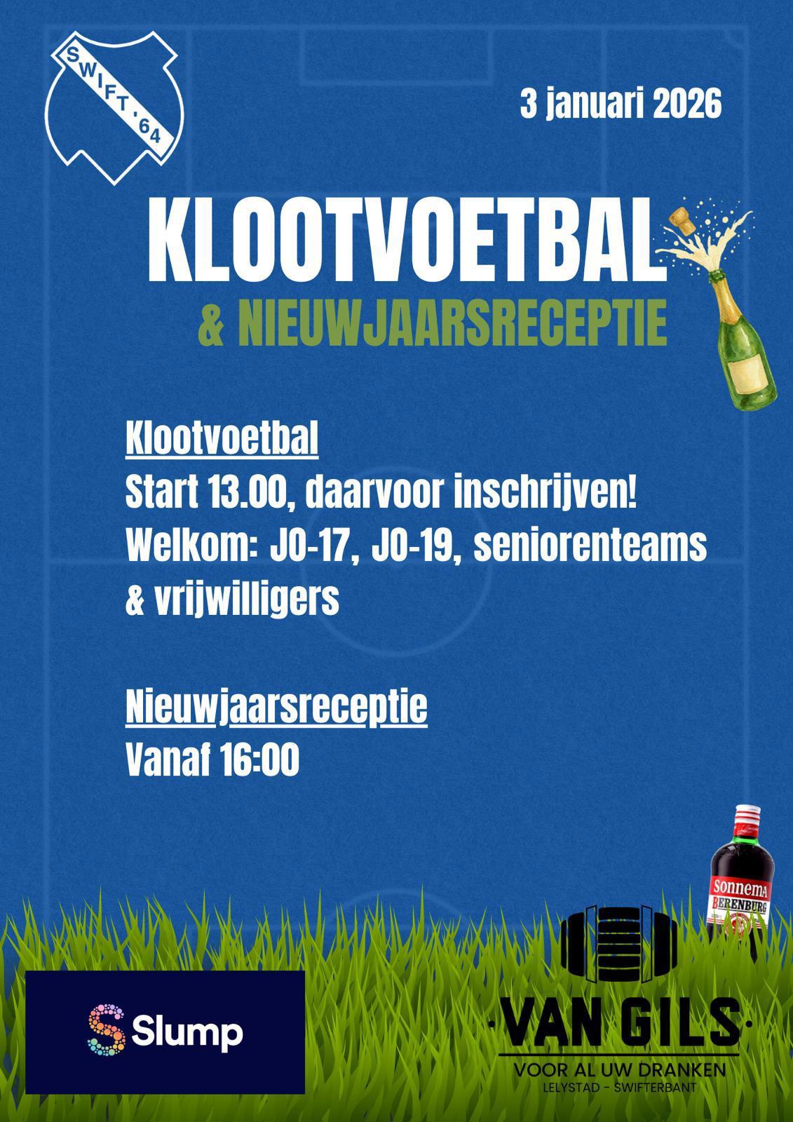 Vanaf 16:00 uur is er een nieuwjaarsreceptie in de kantine voor alle leden en vrijwilligers van de voetbalvereniging Swift ’64. Kom gezellig langs om 2026 in te luiden.